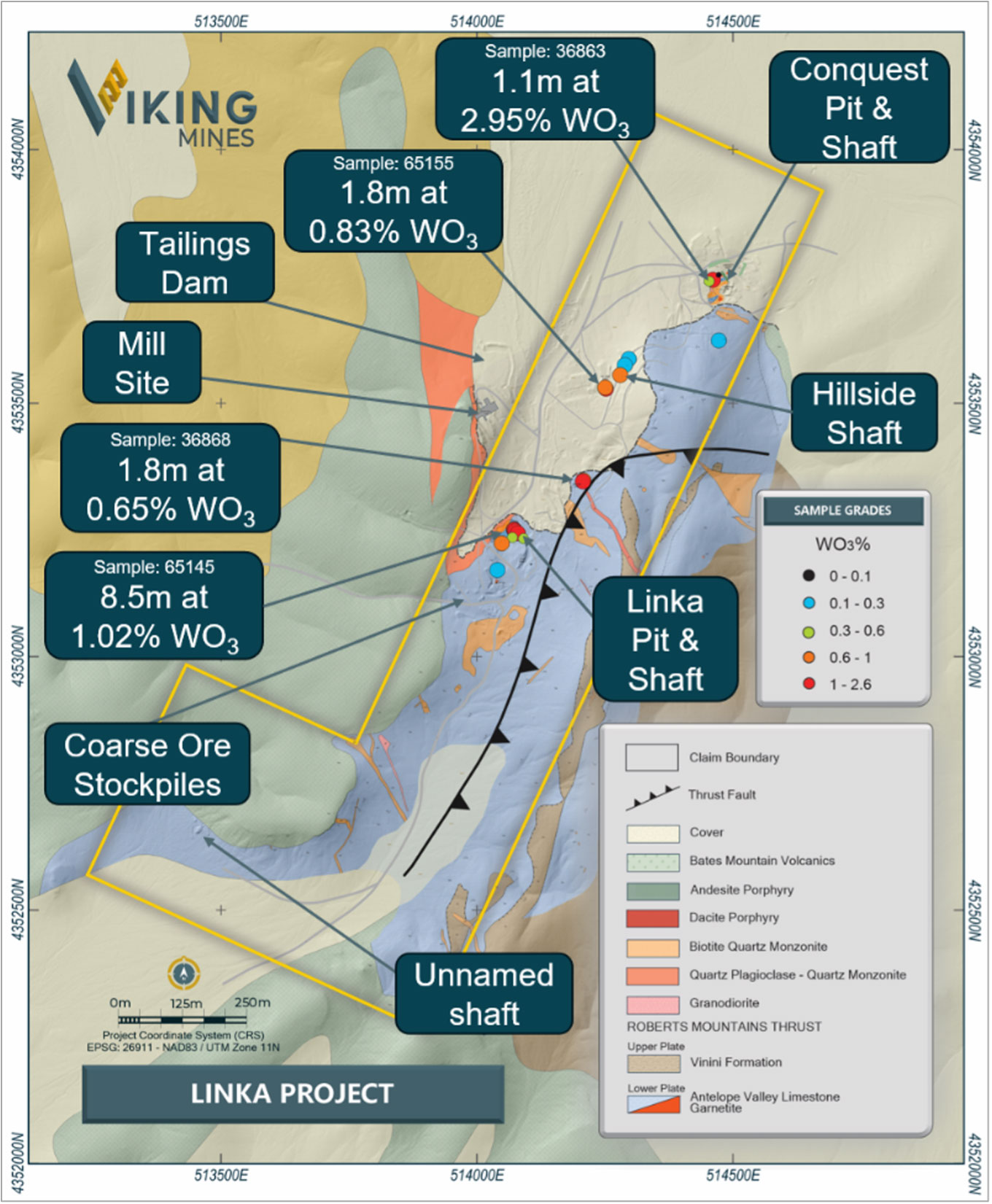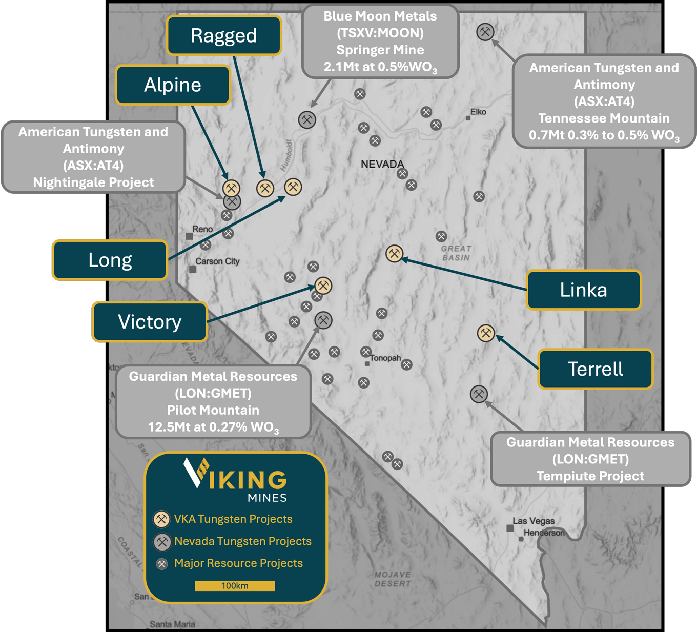The six projects to be acquired by Viking are Linka, Alpine, Long, Terrell, Ragged and Victory, all located within the state of Nevada, USA (Figure 1). Four of the projects have had ore mined via both open pit and underground operations throughout the 20th century for a total production of ~123,000t at 0.54% tungsten oxide (“WO3”).