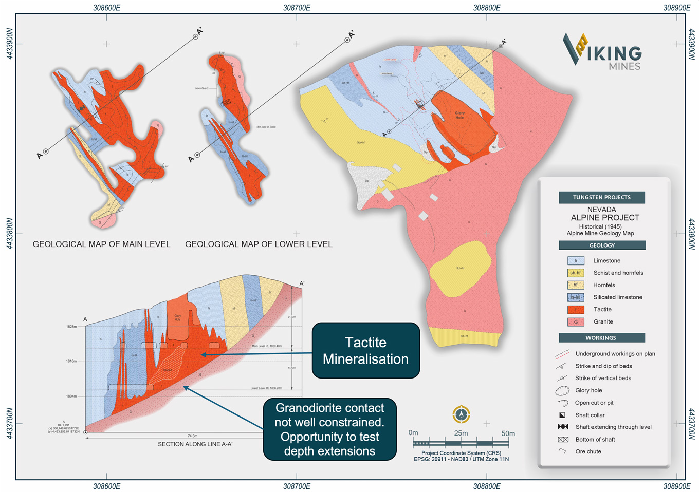 Encompasses the Alpine Mine and is in the Nightingale District of Pershing County. ~39kt mined at 0.60% WO3 from an open pit and underground with ore remnants noted as remaining in the workings and depth extensions to be tested (Figure 9). No drilling has been reported or identified on the Project and the depth extensions represent a logical target for a first pass drilling programme.